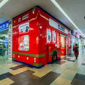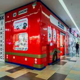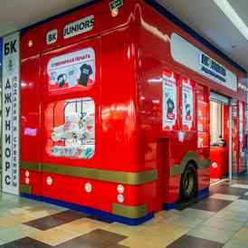 BK Juniors оформлен в необычном формате по дизайнерским чертежам, аналогов такого интерьера в стране однозначно нет. Внешне магазин стилизован под London bus — красный магазин-автобус с настоящими фарами, колесом, а также наливным полом, имитирующим дорожную разметку. Внутреннее пространство магазина также имитирует автобус: плавные линии и современные сочетания дерева и металла в оборудовании создают ощущение романтики путешествий и приятных воспоминаний.